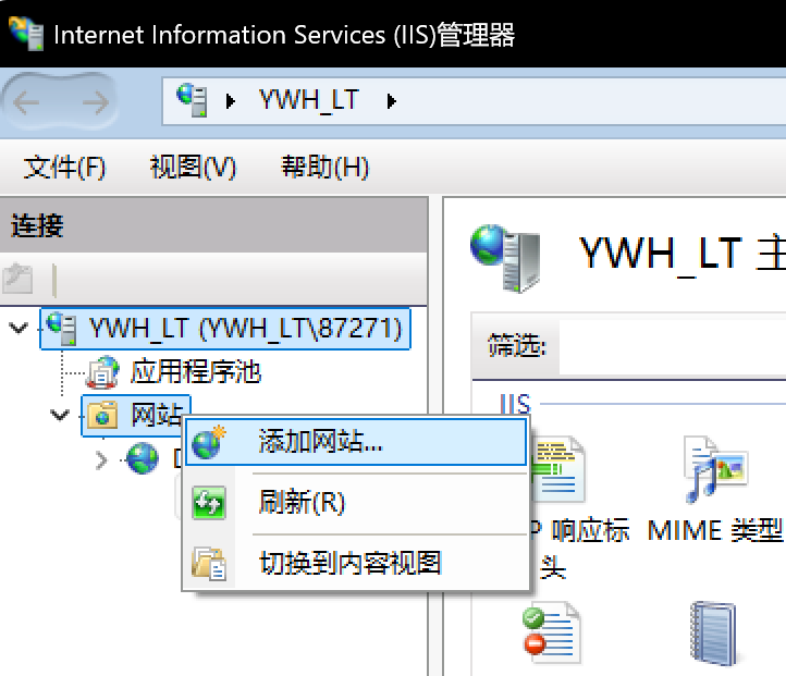 展开左侧“连接”面板中计算机名称,然后右键点击站点,选择“添加网站”。